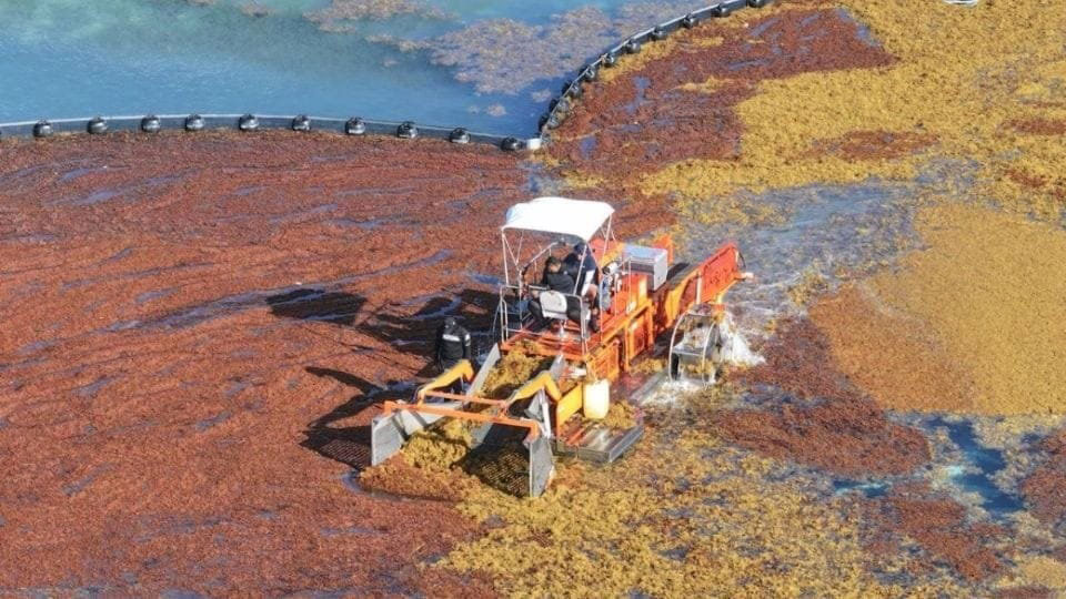 See HENNING MARINE weed harvesting and trash skimming heads floating on lake and land.